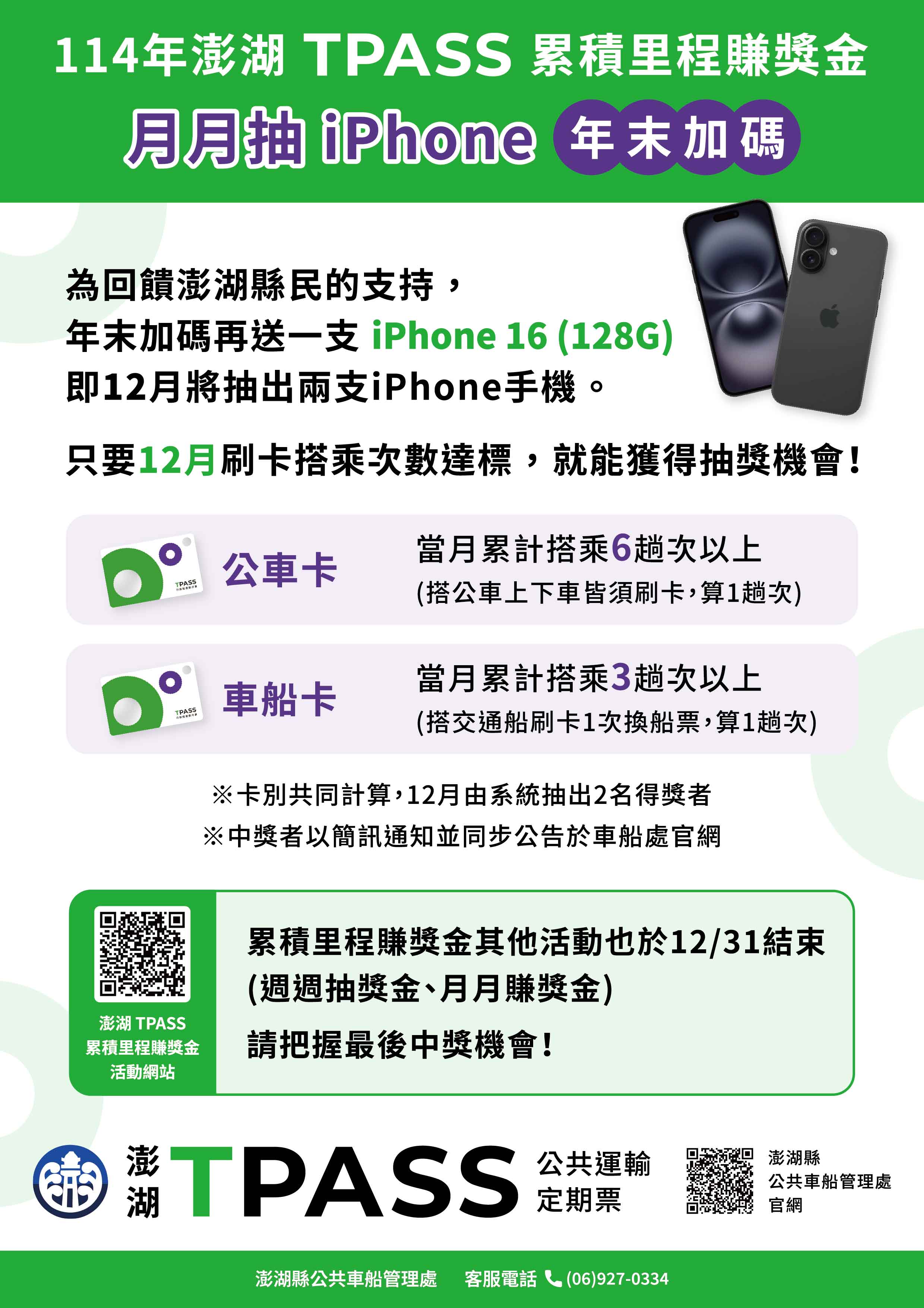114年 澎湖TPASS 累積里程賺獎金「月月抽iPhone」年末好康大加碼